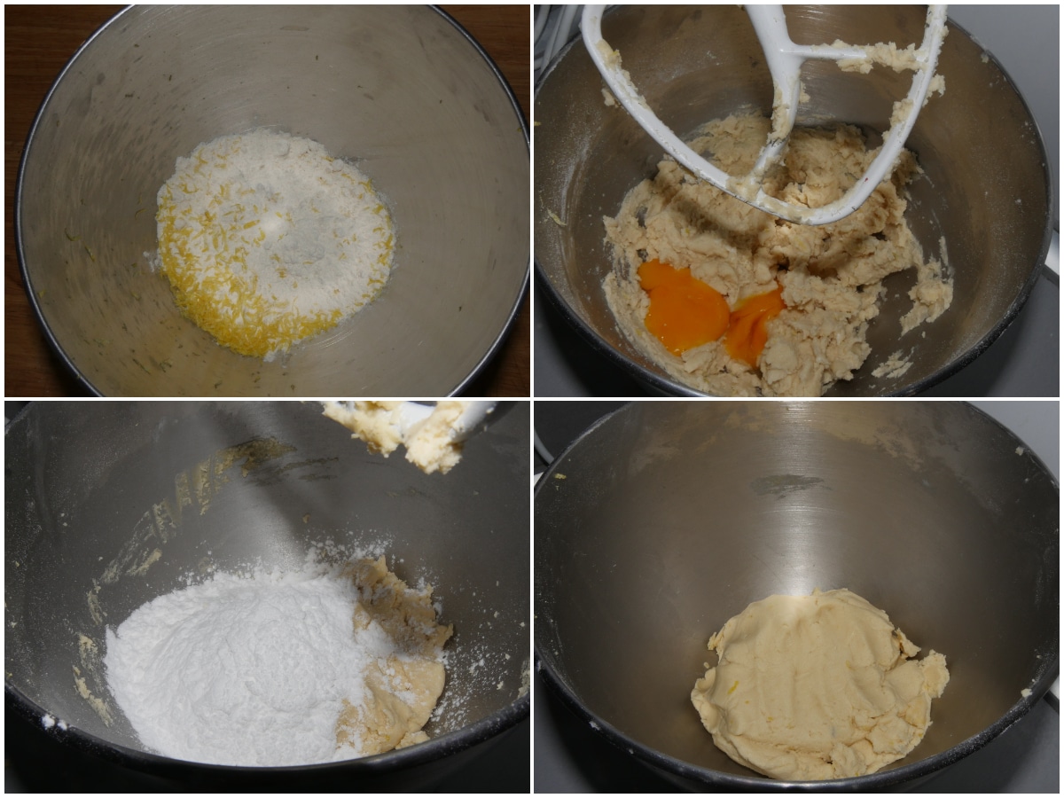 Unite farina, burro e buccia di limone in una ciotola e lavorate fino ad ottenere un composto sabbioso, poi incorporate i tuorli e infine anche lo zucchero.