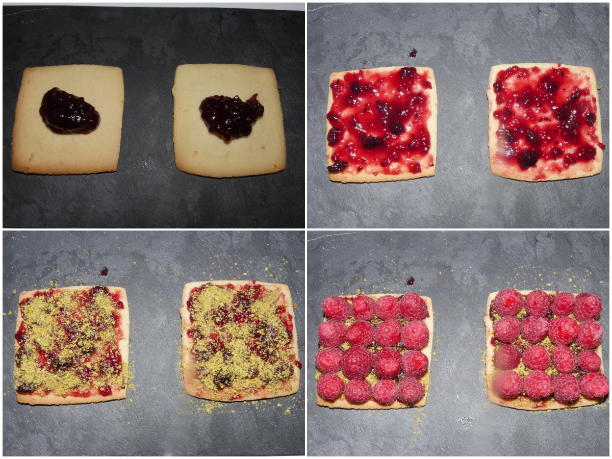 Una volta completamente fredde, farcite le vostre basi di pasta sablè con confettura, granella e lamponi.
