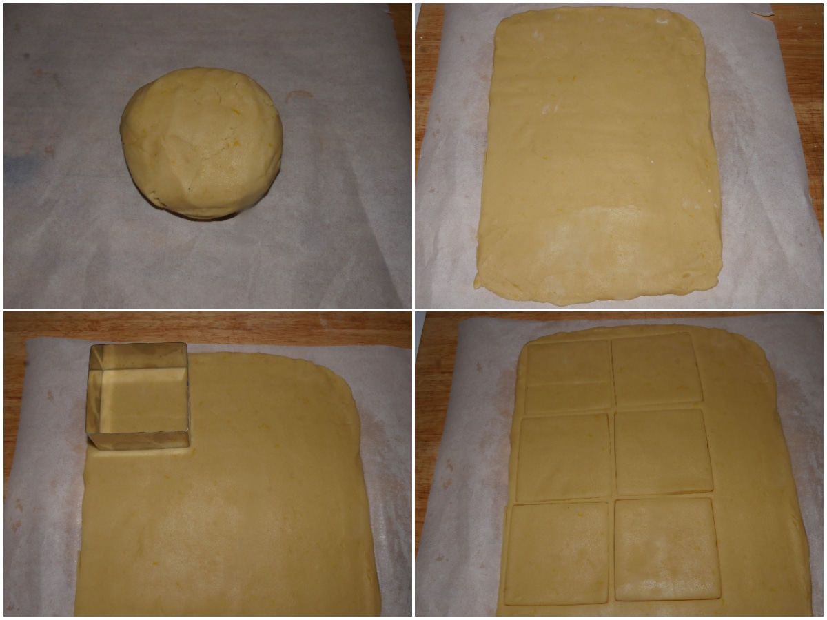 Riprendete l'impasto, stendetelo su un foglio di carta forno e ricavate le vostre formine quadrate (o di altra forma): il mio stampino era da circa 8 cm per lato.