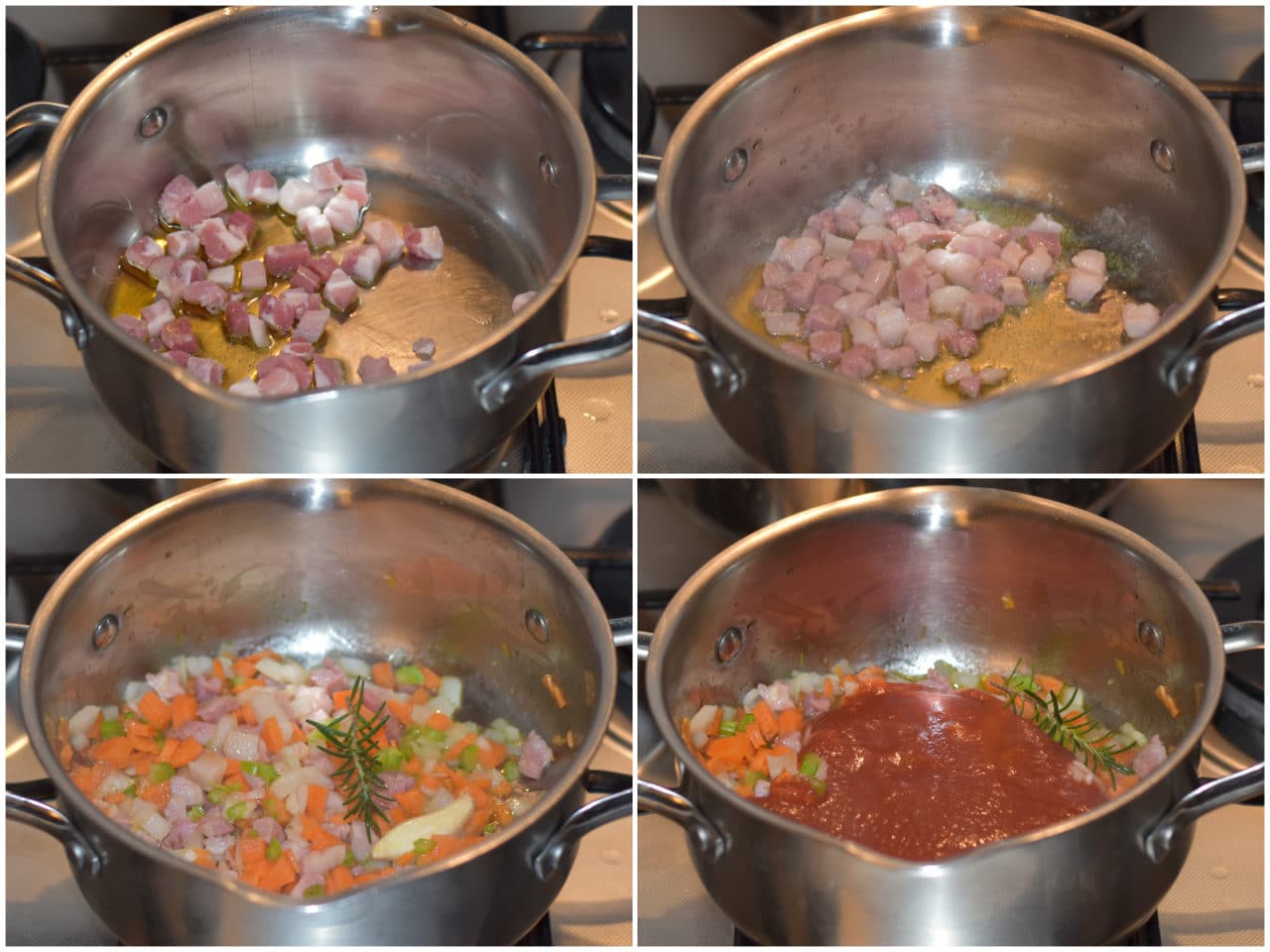 Intanto fate dorare la pancetta in una casseruola ampia con poco olio, poi unite sedano, carota e cipolla tritati, l'aglio mondato e il rosmarino e lasciateli appassire, poi unite la passata di pomodoro.