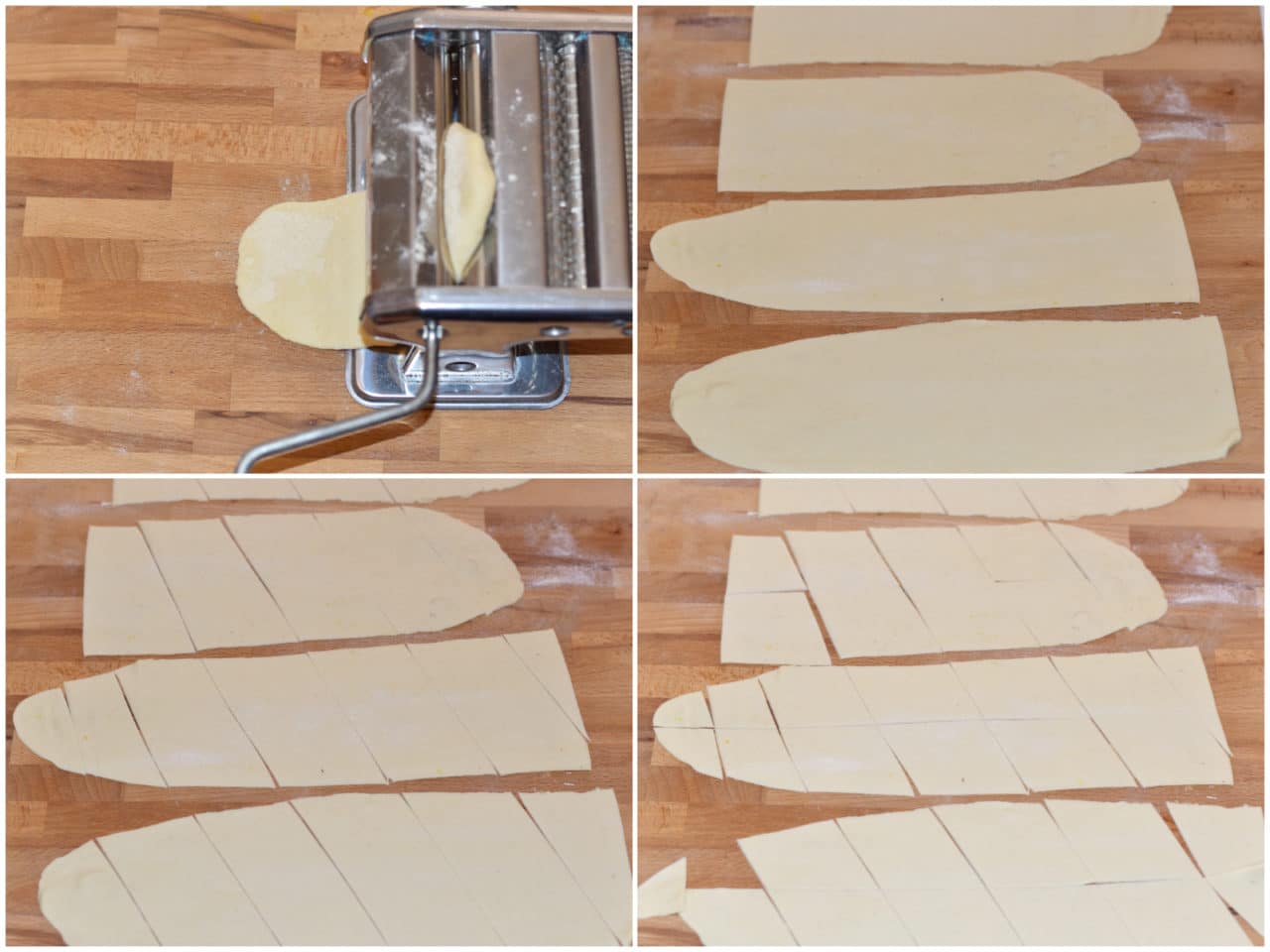 Ricavate quindi dalle sfoglie dei rombi irregolari di 3-4 cm di lunghezza.