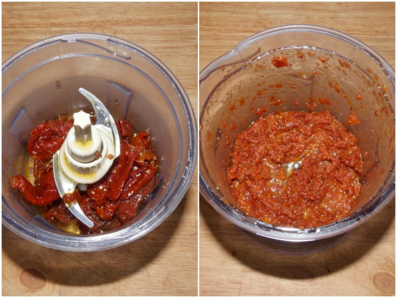 Innanzitutto scolate i pomodori secchi e frullateli fino ad ottenere un patè.
