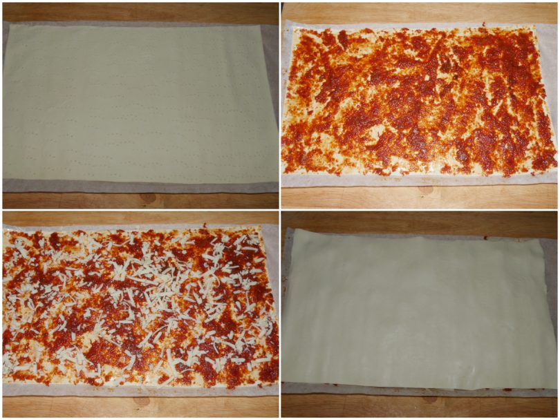 Spalmate il patè sulla prima sfoglia e aggiungete il formaggio grattugiato , quindi coprite con la seconda sfoglia e sigillate i bordi.