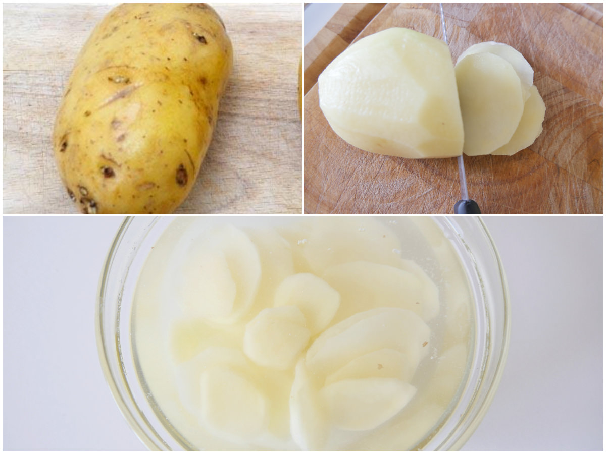 Innanzitutto pelate le patate, tagliatele a fettine molto sottili (potete usare una mandolina o un coltello a lama liscia ben affilato) e lasciatele in una ciotola, ben ricoperte di acqua fredda, per almeno 30 minuti (in questo modo perderanno un po' di amido e risulteranno più croccantine dopo la cottura).