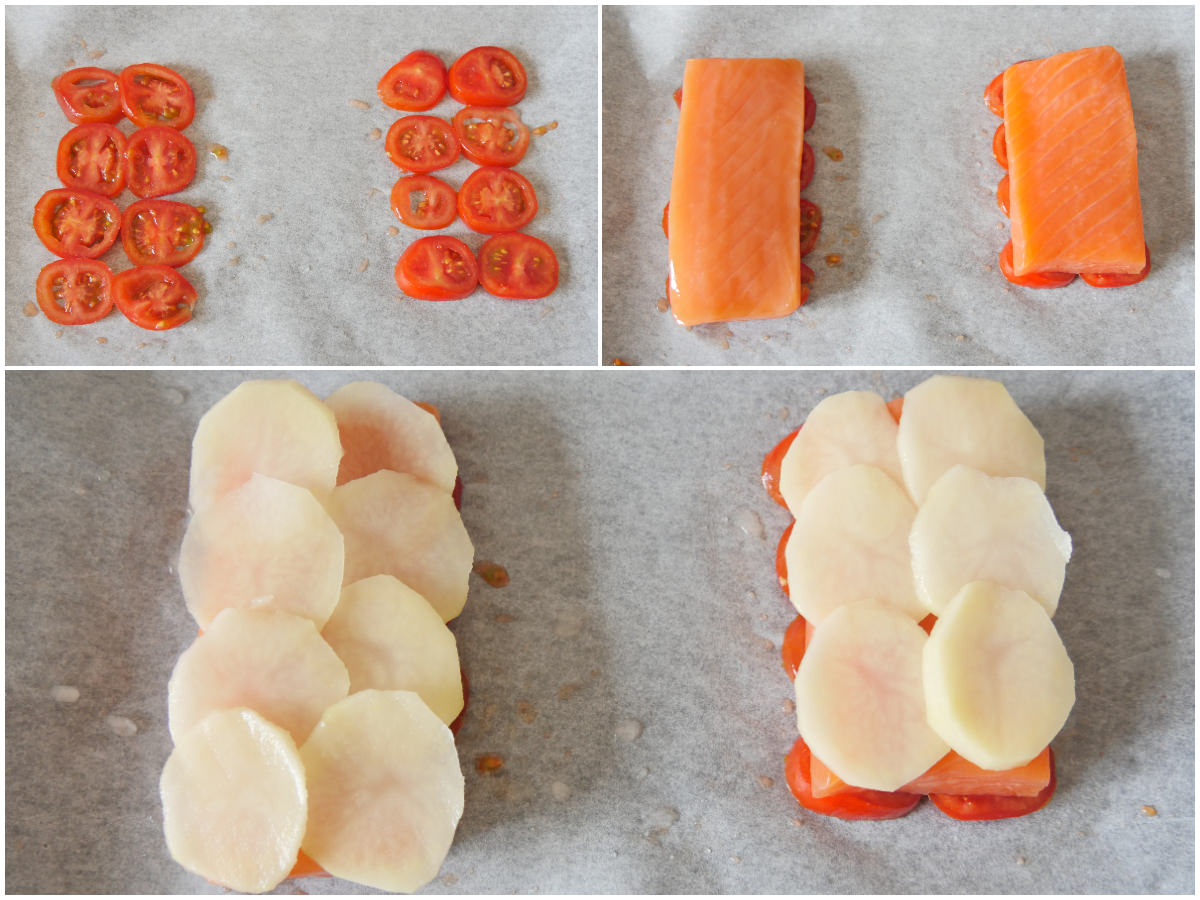Purtroppo qualcosa non ha funzionato nella realizzazione di questa ricetta: le patate (tagliate in sfoglie millimetriche) nonostante la cottura in forno di 30 minuti non si sono cotte (a differenza del salmone e dei pomodorini), e ho dovuto servirle mezze crude. Consiglierei di sbollentare le sfoglie di patate qualche minuto prima di posizionarle sul salmone, per esser certi che siano cotte. A presto, Cocorì