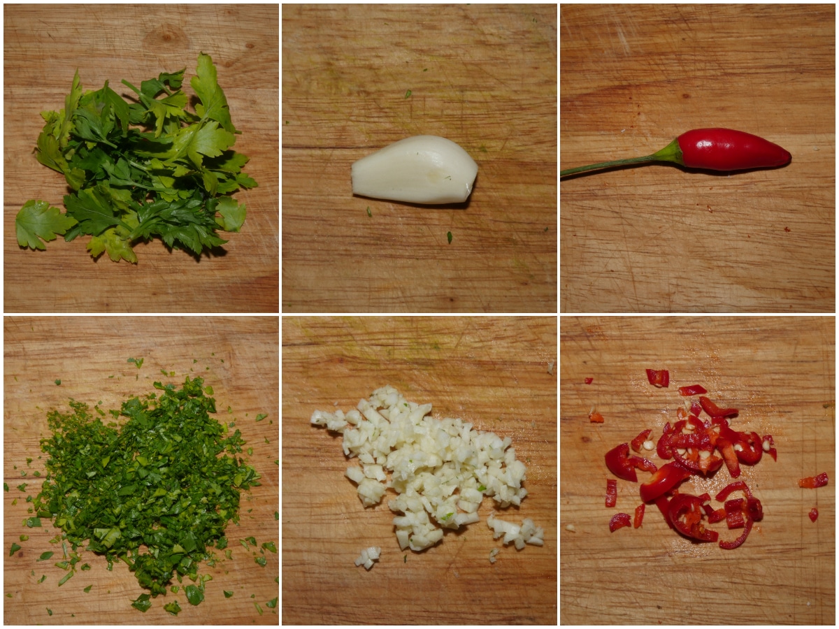 Preparate gli ingredienti: tritate aglio e prezzemolo, sminuzzate il peperoncino, spremete il limone e predisponete il resto a portata di mano.