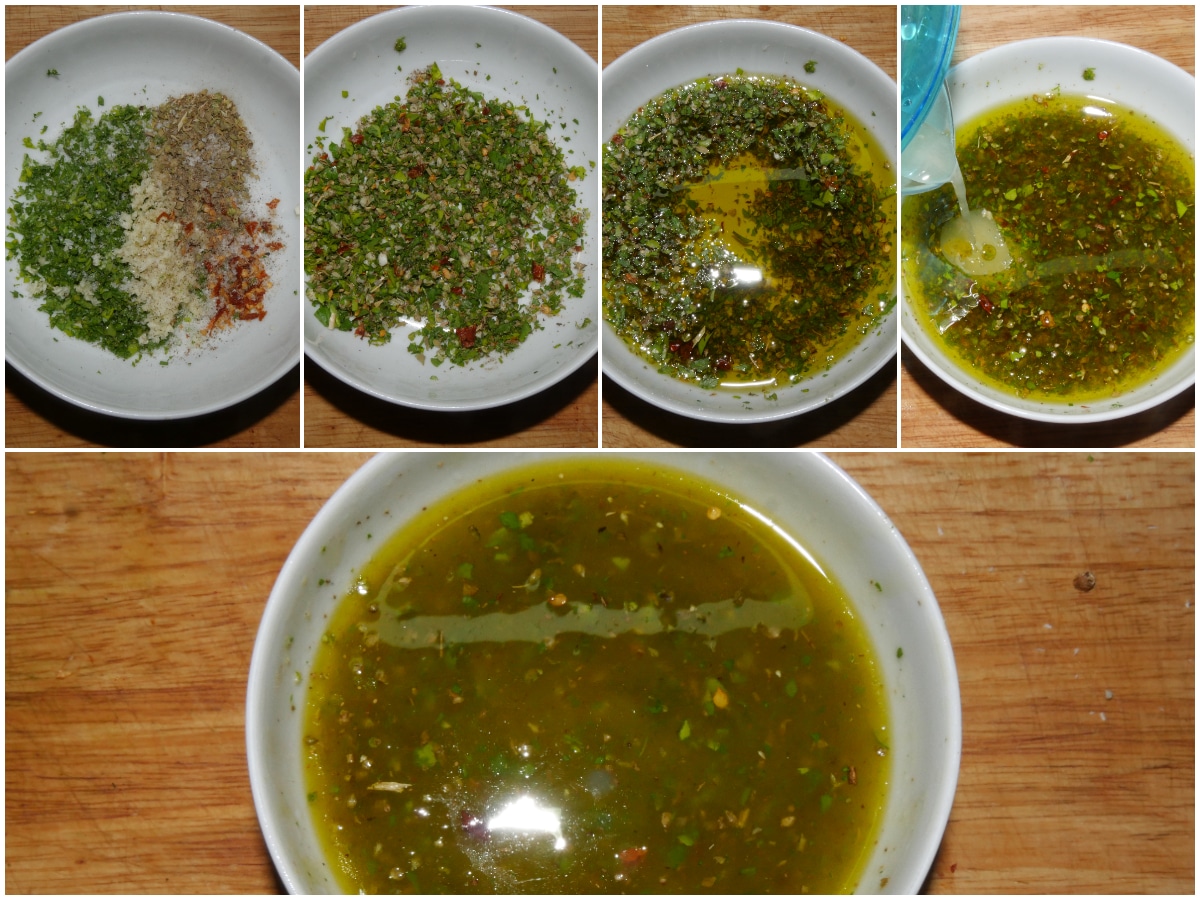 Mettete tutti gli aromi (prezzemolo, aglio, peperoncino, origano, sale e pepe) in una ciotolina e mescolate, quindi aggiungete l'olio e il succo di limone ed emulsionate.