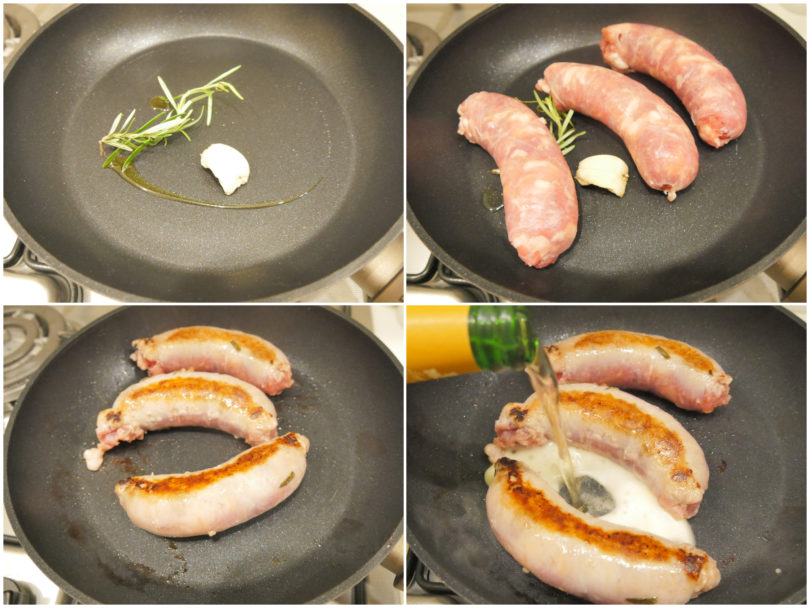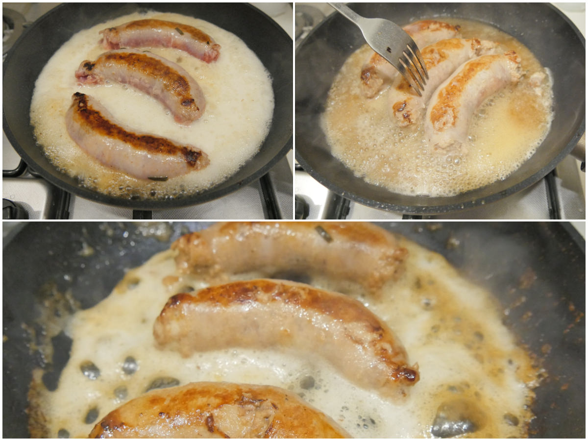 Aggiungete le salsicce e fatele rosolare per bene da entrambi i lati, quindi eliminate gli aromi e unite anche la birra.