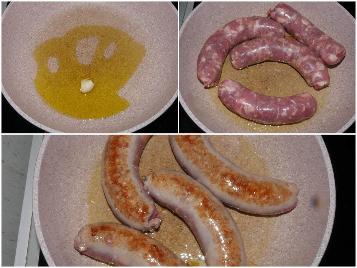 Innanzitutto fate insaporire l'olio con l'aglio (eventualmente potete aggiungere già un po' di timo, se avete scelto di usarlo), quindi unite le salsicce e fatele rosolare bene da tutti i lati.