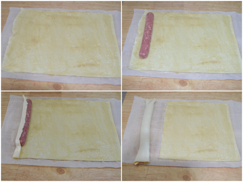 Adagiate la salsiccia, un pezzo per volta, sulla pasta e richiudeteci la sfoglia sopra.