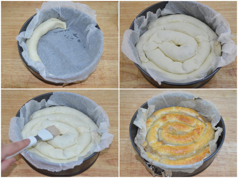 Disponete i pezzi di salsiccia nello stampo uno dopo l'altro, arrotolandoli come a voler formare una grande chiocciola.