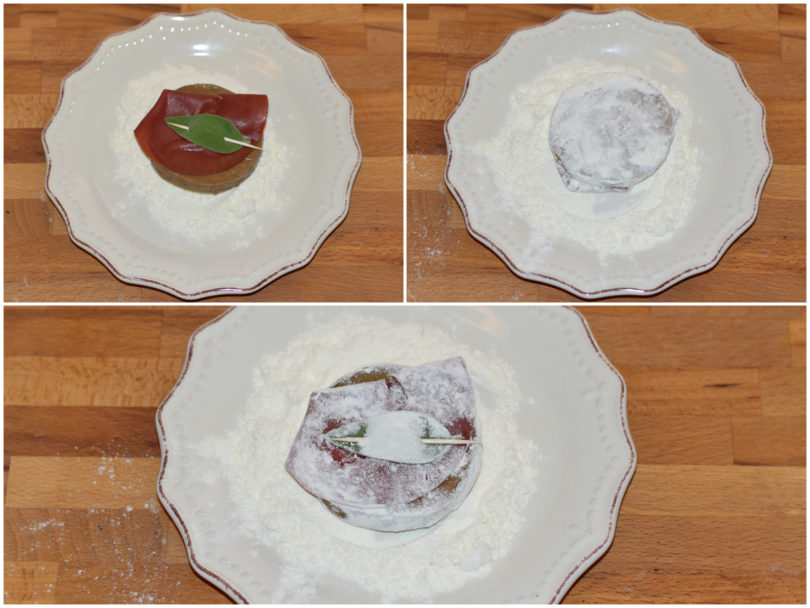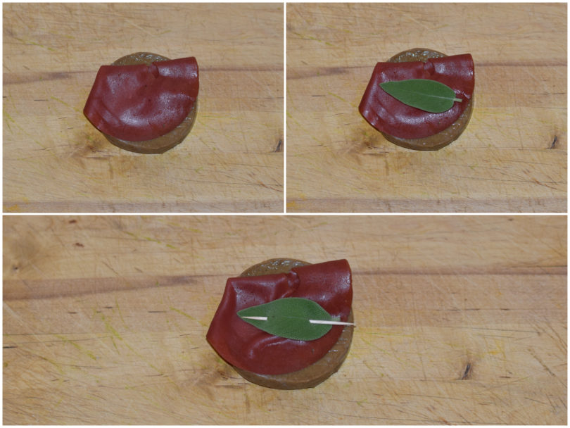 Disponete una fettina di affettato e una foglia di salvia (lavata e asciugata) su ogni fetta di seitan e fermate tutto con uno stuzzicadenti.