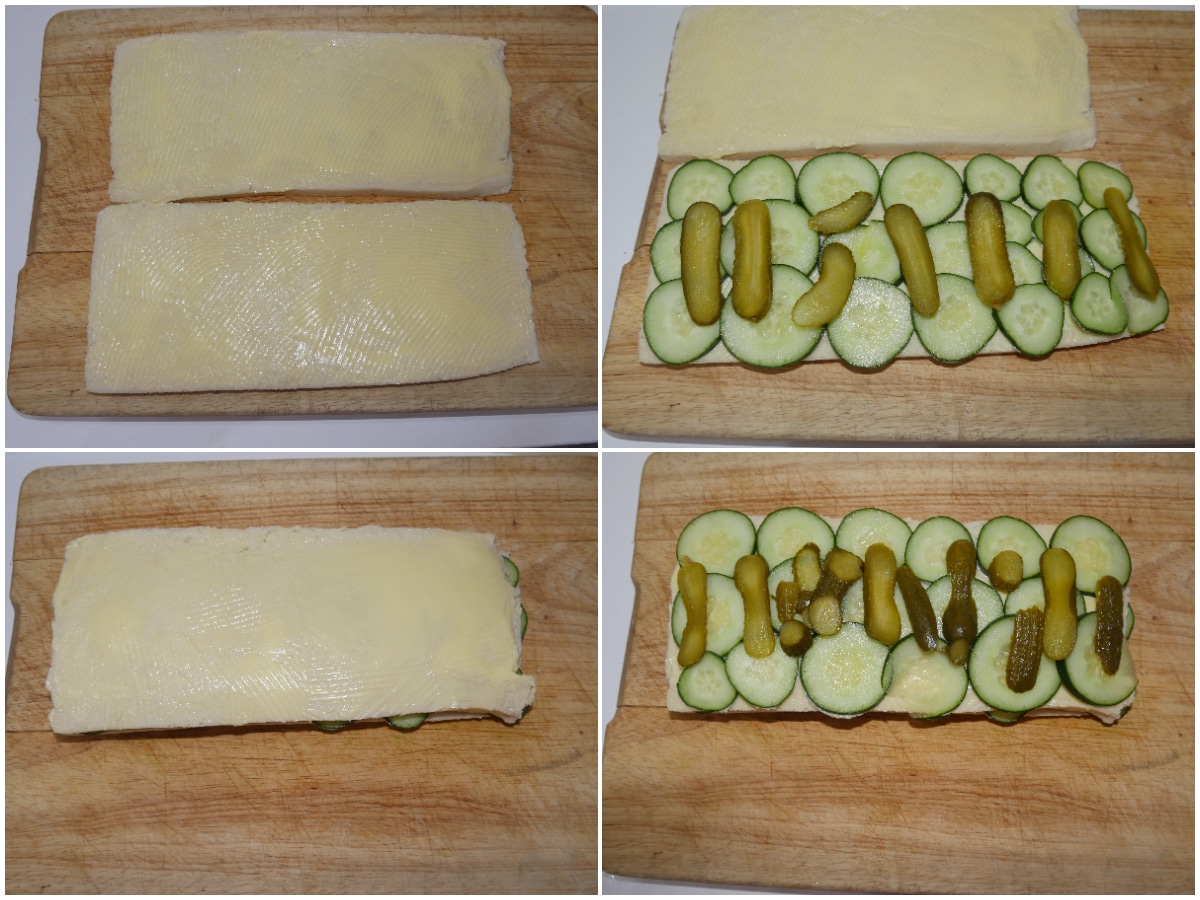 Iniziate quindi ad assemblare il vostro sandwich: disponete le fettine di cetriolo sulla prima fetta imburrata (tenendo il lato imburrato verso l'alto e coprendolo con i cetrioli) e aggiungete qualche pezzetto di cetriolini e pepe a piacere; coprite con la seconda fetta imburrata e create un secondo strato con cetrioli, cetriolini e pepe; procedete analogamente anche per il terzo strato.