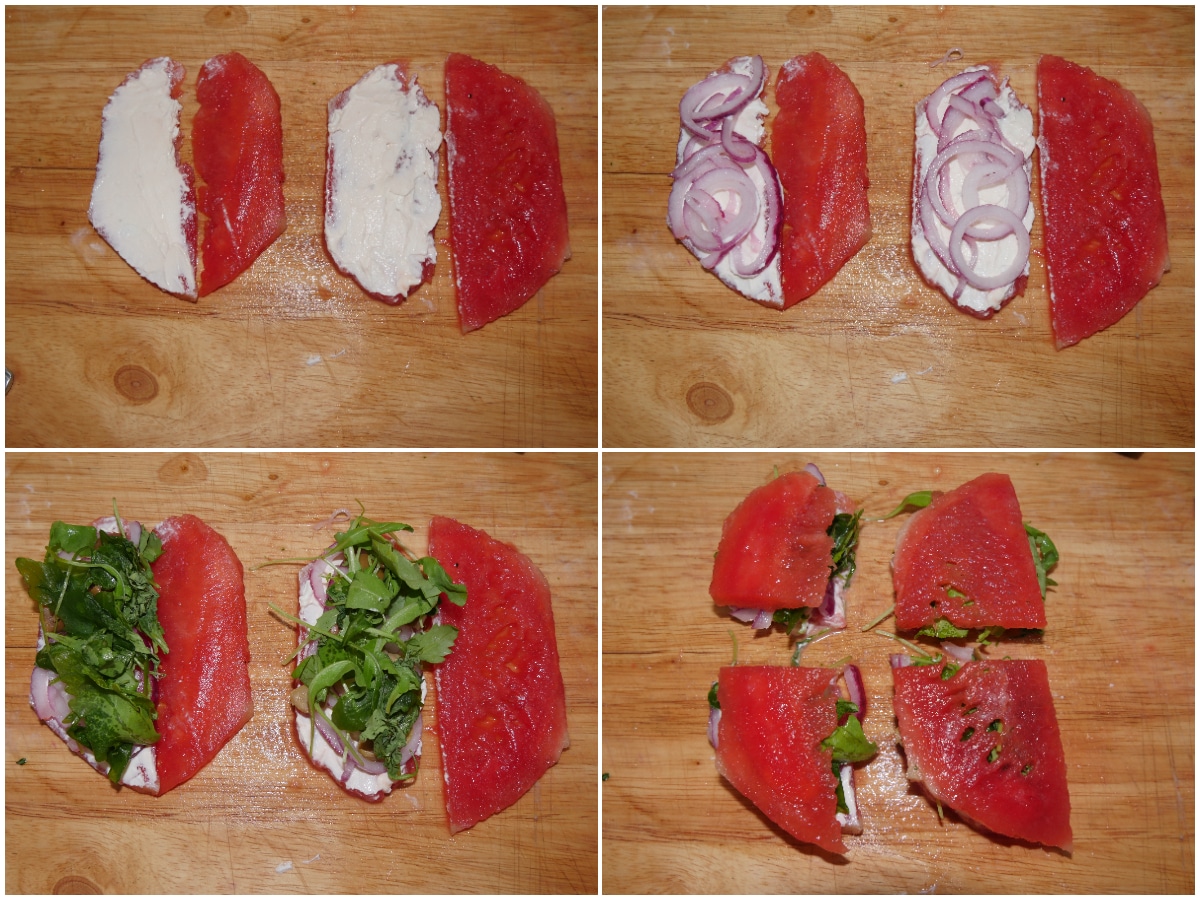 Distribuite su 4 delle vostre 8 fette di anguria il formaggio caprino, poi aggiungete la cipolla, la rucola e le olive.