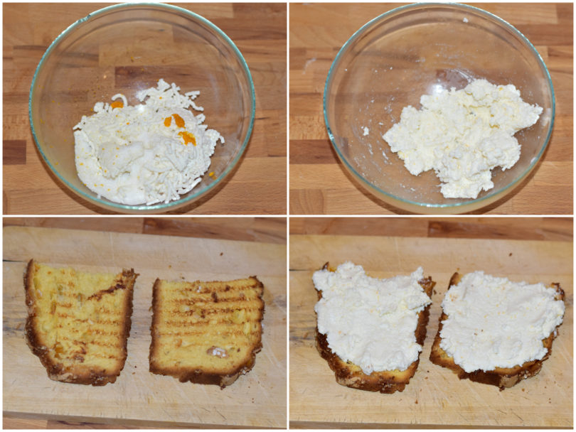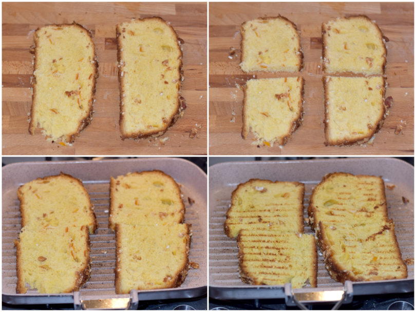 Tagliate le 2 fette di colomba, dividetele a metà e grigliatele su di una bistecchiera arroventata, da entrambi i lati.