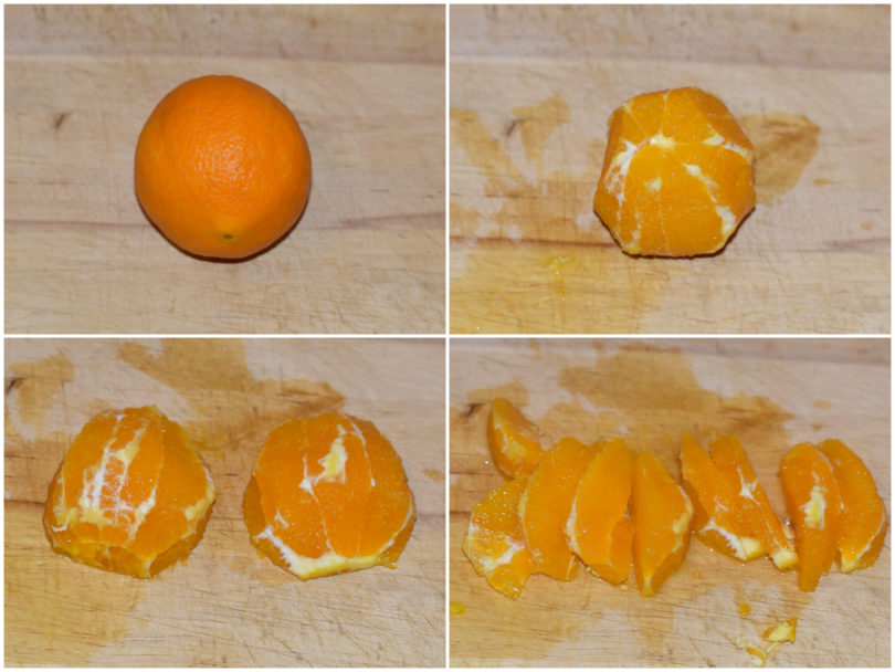 Pelate l'arancia a vivo e dividetela in spicchi.
