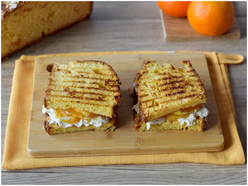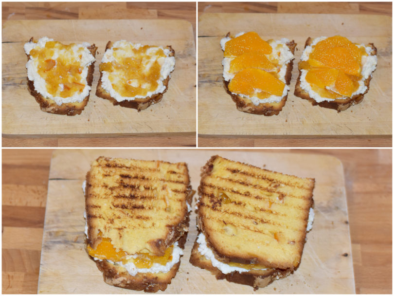 Completate i sandwich aggiungendo prima la marmellata e poi le fettine di arancia, quindi coprite con le fette di colomba restanti.