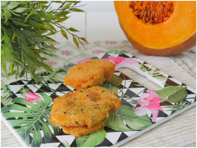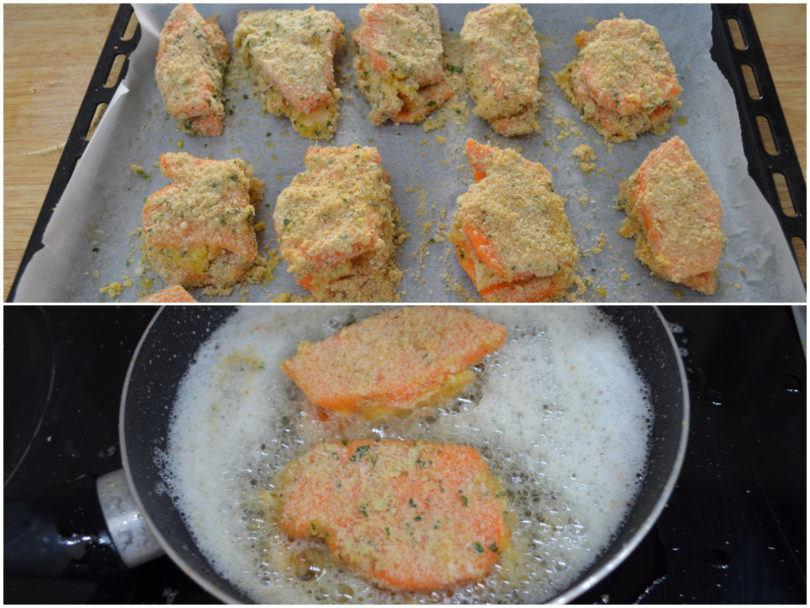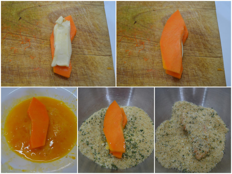 Ora assemblate i sandwich: mettete un pezzetto di provola su una fettina di zucca, chiudete con un altra fetta di zucca, quindi passate il tutto, come se fosse un cordon bleu, prima nelle uova leggermente sbattute, poi nella panatura, cercando per quanto possibile di sigillare i bordi dei sandwich con la panatura.