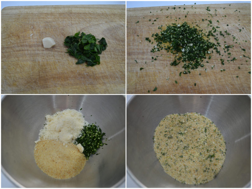 Preparate la panatura: tritate finemente aglio e prezzemolo, quindi mischiateli con parmigiano e pangrattato.