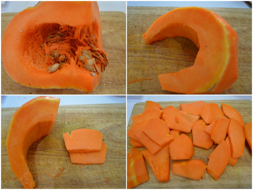 Pulite la zucca e tagliatela in fettine di circa 1-2 cm.