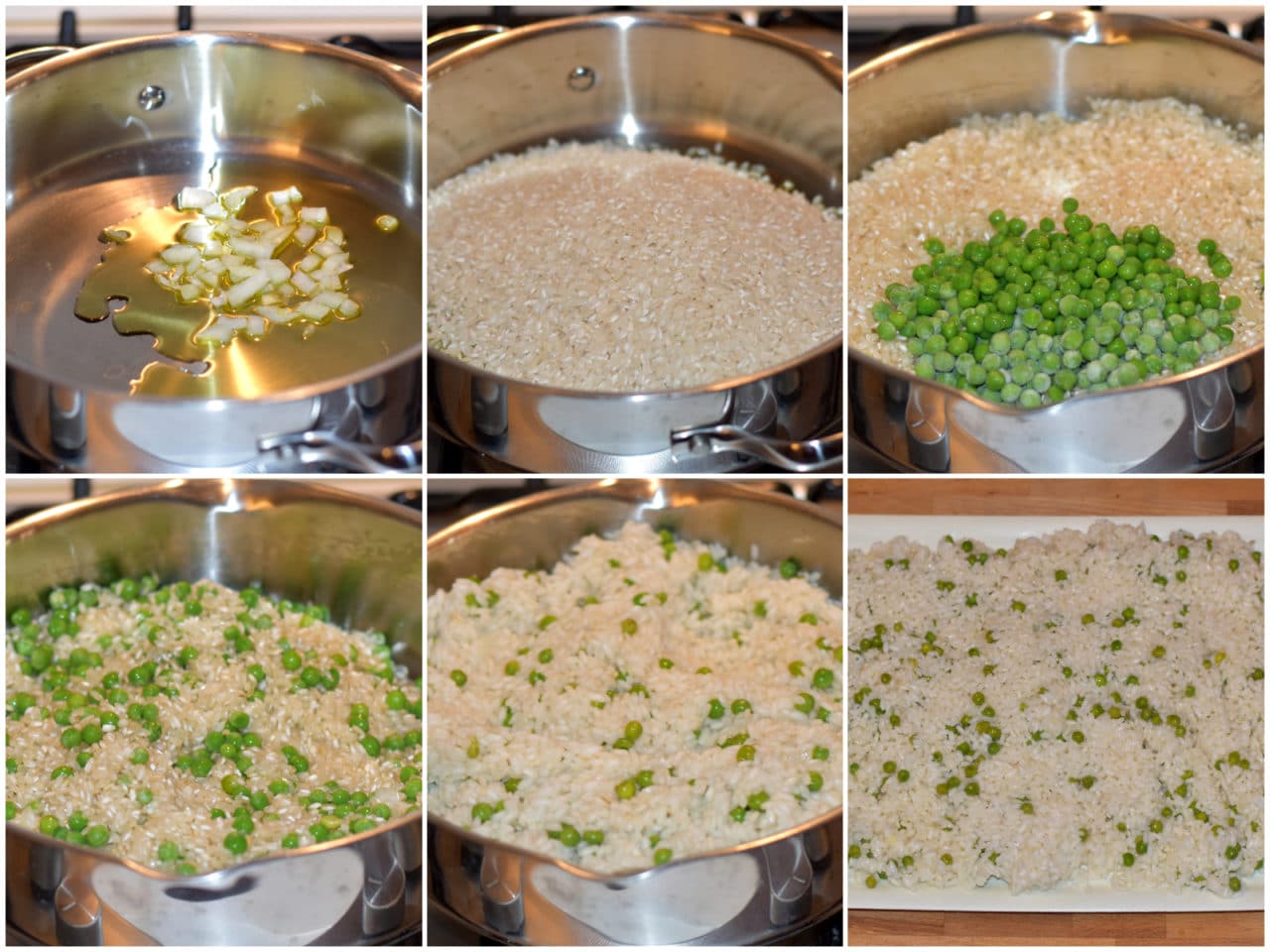 Lasciate appassire la cipolla tritata con olio di oliva in una casseruola, unite il riso e lasciatelo tostare nel condimento, quindi aggiungete anche i piselli, lasciate insaporire velocemente e poi sfumate con il vino.