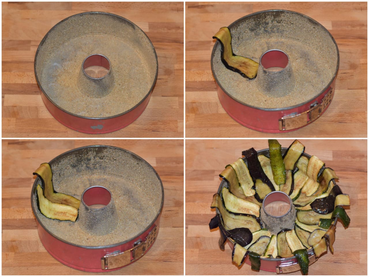 Ungete lo stampo e cospargetelo di pangrattato, poi foderatelo con le fettine di melanzane e zucchine fritte, alternandole tra loro e sovrapponendole leggermente, in modo da non lasciare spazi.