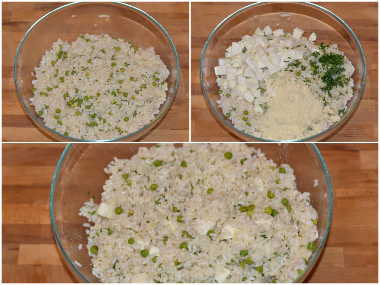 Tagliate la mozzarella a dadini e unitela al riso, insieme con prezzemolo e parmigiano.