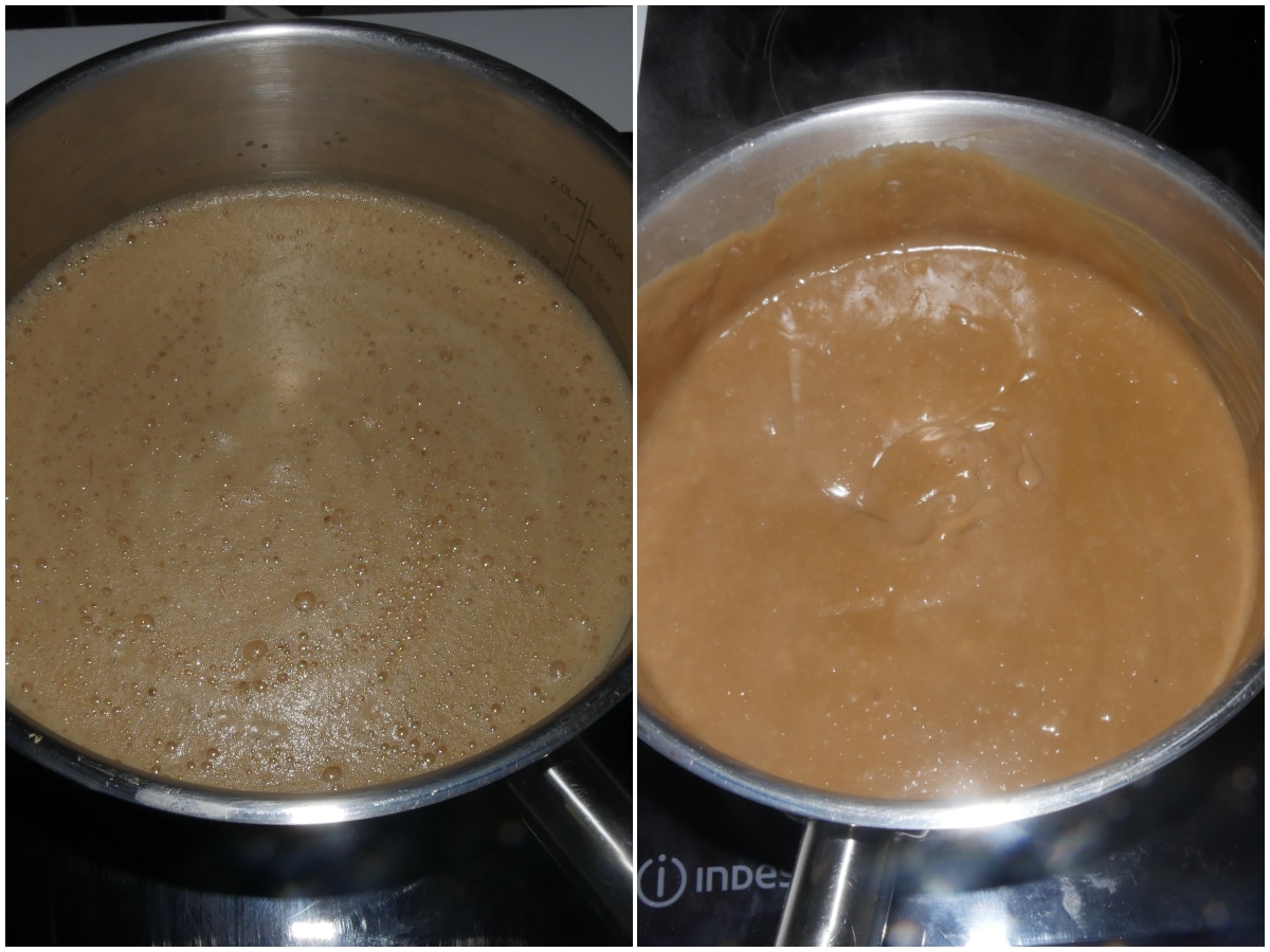 Trasferite il composto in un pentolino e cuocete a fiamma medio-bassa fino ad ottenere una crema densa, mescolando continuamente.