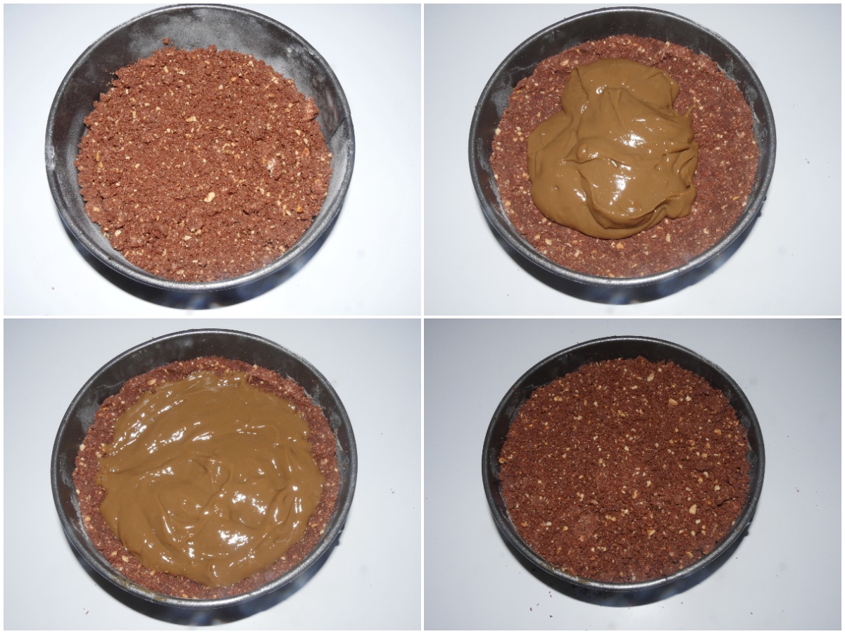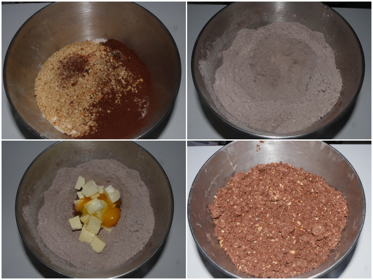 Preparate la base: tritate le nocciole in modo non troppo fine (in modo che resti qualche pezzettino più grande), aggiungete zucchero, cacao, farina, lievito e sale e mescolate.