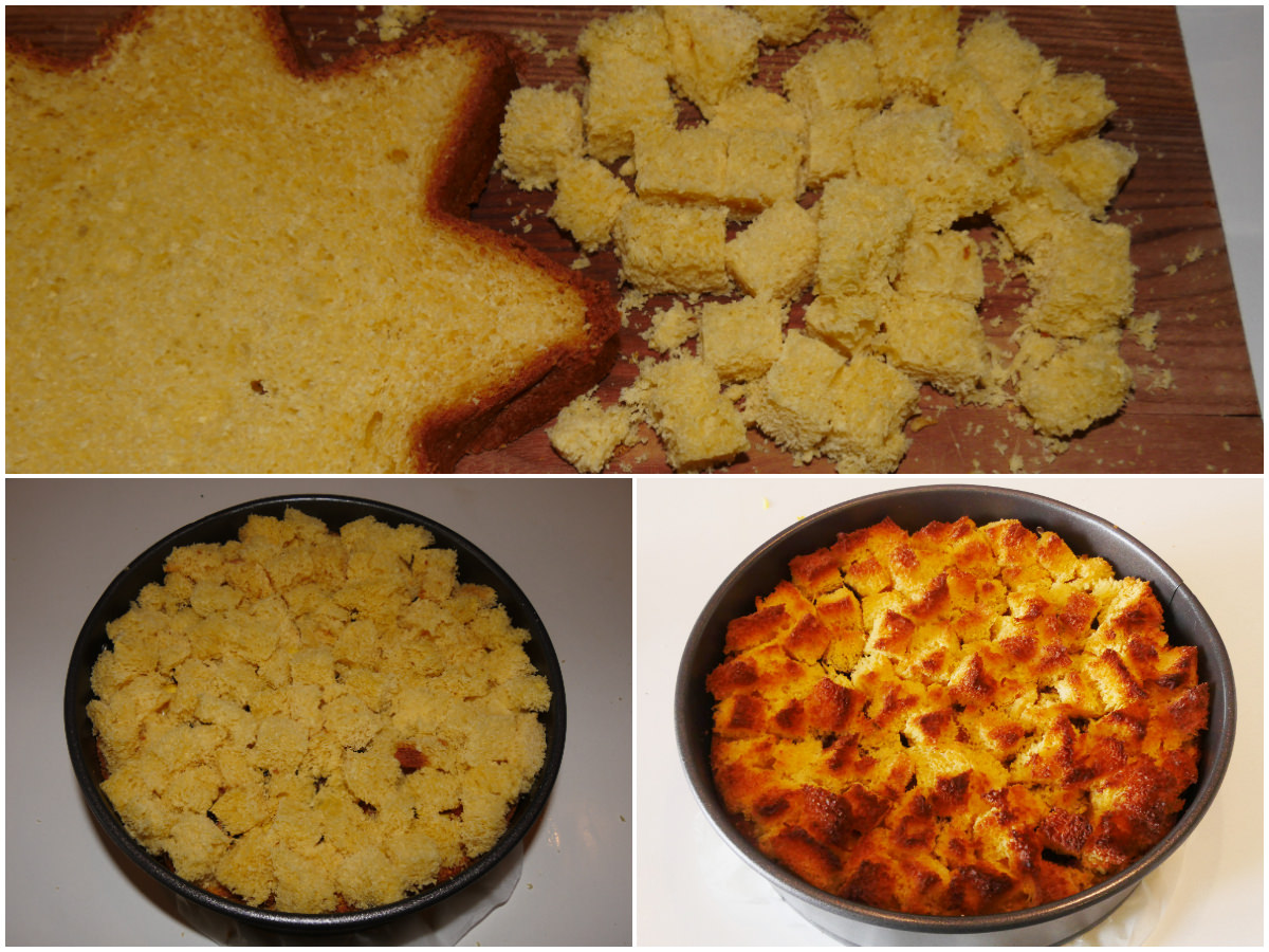 Tagliate il pandoro restante a cubetti e coprite tutta la superficie, quindi infornate in forno ventilato preriscaldato a 180°C e cuocete per circa 10 minuti o finché non sarà ben dorato, quindi fate raffreddare per almeno 2 ore.