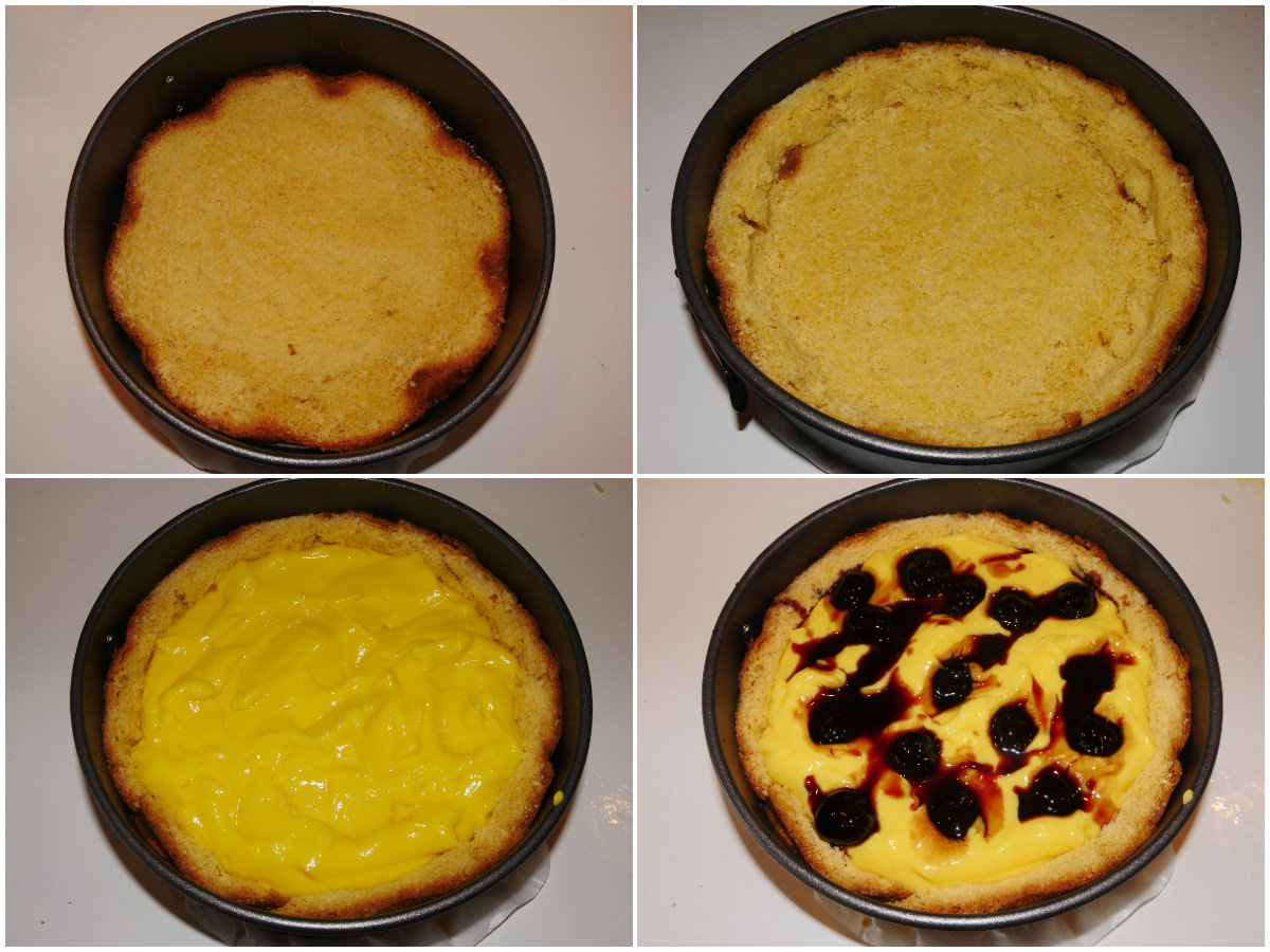 Bagnate fondo e bordi con la bagna, quindi versate la crema sulla base e livellate la superficie, poi distribuite anche le amarene sulla crema.