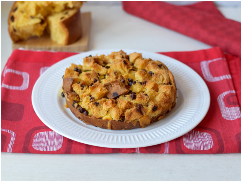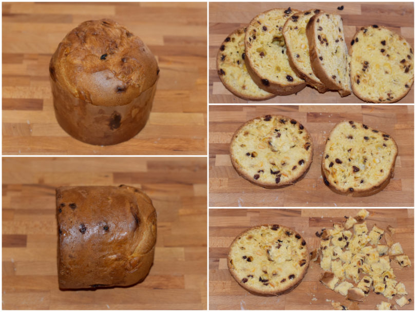 Tagliate il panettone a fette da 2 cm di spessore in senso orizzontale, tenete da parte il disco inferiore e tagliate gli altri a cubetti.