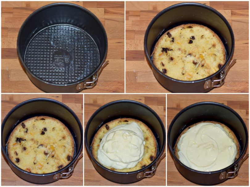 Mettete il disco di panettone rimasto sulla base dello stampo e bagnatelo con il succo di arancia, poi distribuiteci sopra la crema, cercando di creare uno strato omogeneo.