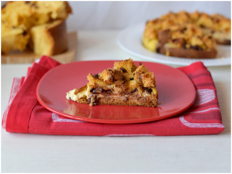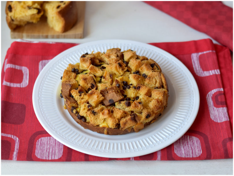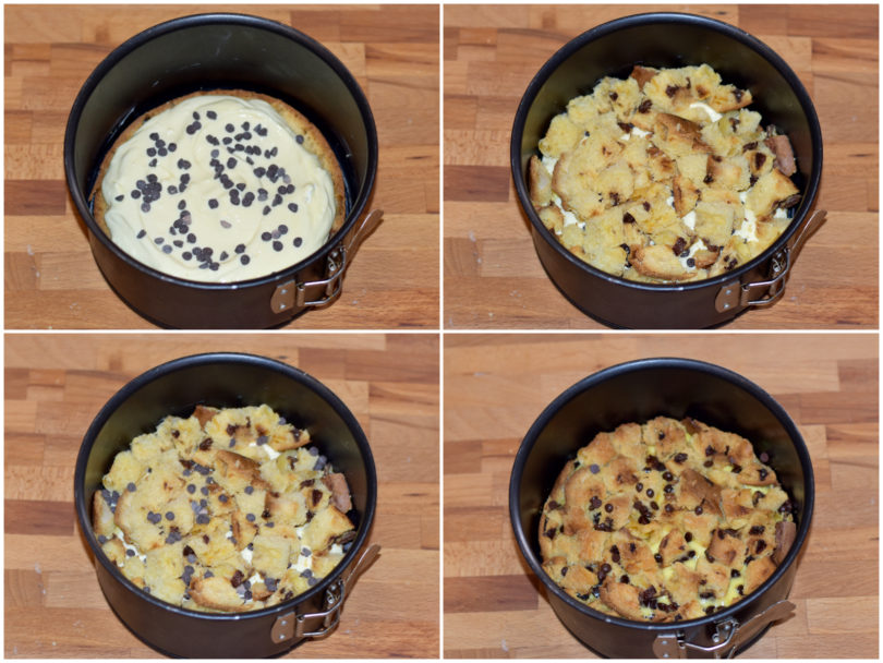 Aggiungete anche le gocce di cioccolato e poi ricoprite il tutto con i cubetti di panettone, quindi cuocete per circa 25 minuti o fino a leggera duratura in forno statico preriscaldato a 180°C.