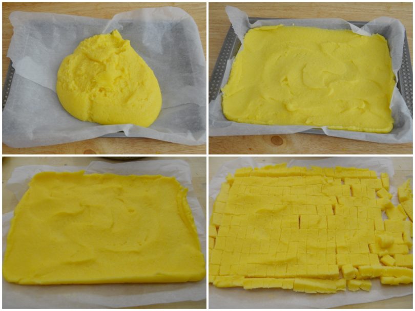 Quando sarà fredda, tagliatela a cubetti (o, in alternativa, potete sbriciolare la polenta con le dita).