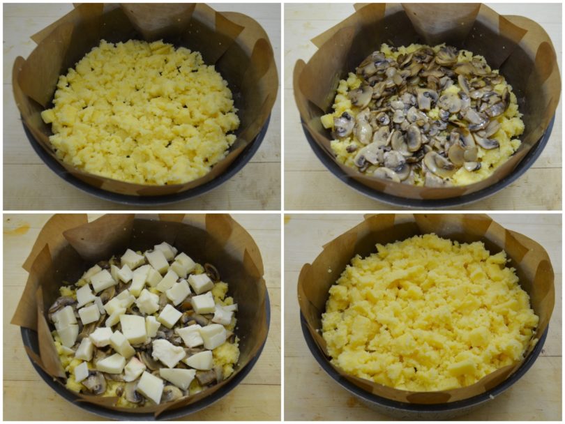 Aggiungete i funghi trifolati e i formaggi a cubetti, quindi ricoprite uniformemente con la polenta restante.