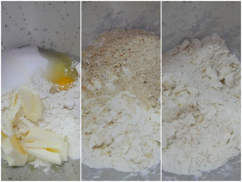 Nel frattempo, preparate la frolla: in una ciotola, unite farina, farina di nocciole, lievito, uovo, buro e zucchero e impastate velocemente, fino ad ottenere una consistenza secca e "sbriciolosa".