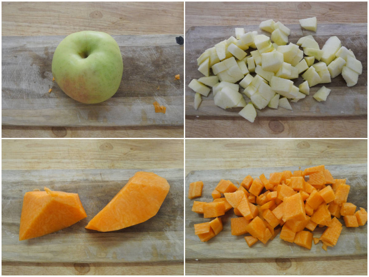Innanzitutto iniziate a preparare il ripieno: pulite mela e zucca e tagliate tutto a dadini, preferibilmente di dimensioni abbastanza simili tra loro.