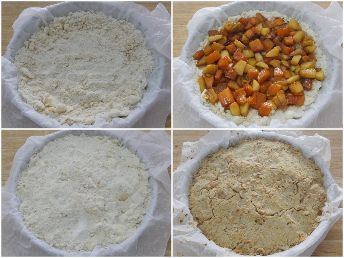 Mettete 2/3 del composto sul fondo dello stampo rivestito di carta forno, cercando di livellare e compattare leggermente.
