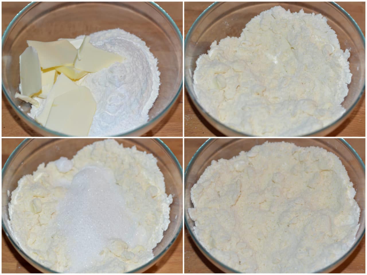 Innanzitutto preparate la frolla: lavorate la farina con il burro a tocchetti, poi unite zucchero, lievito, vaniglia e uova e amalgamate bene.