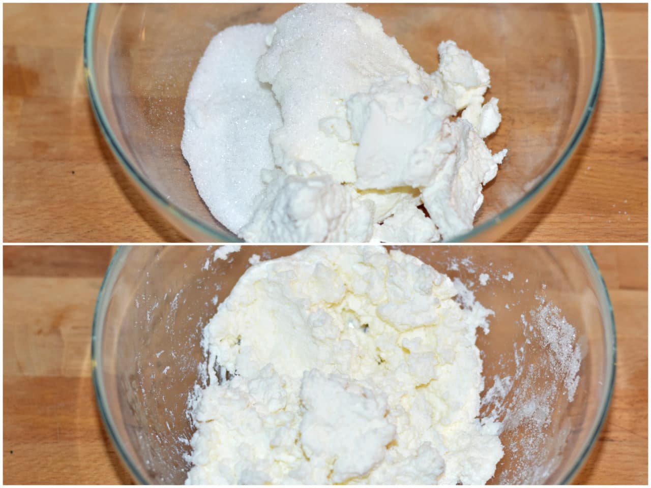Aggiungete lo zucchero alla ricotta e lavorate bene con una forchetta (o con le fruste elettriche) fino ad ottenere un composto uniforme.