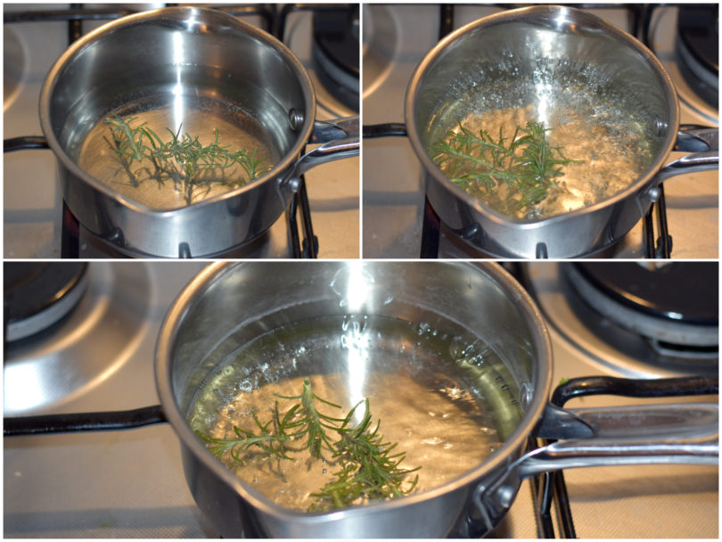 Innanzitutto mettete in una pentola 375 gr di acqua e il rosmarino e portate a ebollizione, continuate a far bollire fin quando l'acqua non sarà dimezzata (ve ne serviranno circa 175 gr), poi lasciate intiepidire.