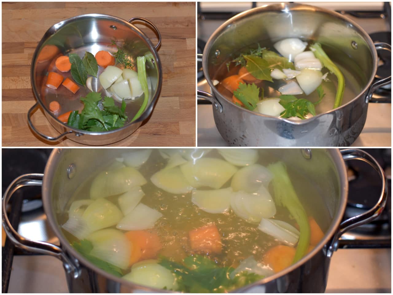 Innanzitutto preparate il brodo: mondate le verdure, tagliatele a pezzi e mettetele in una pentola capiente.
