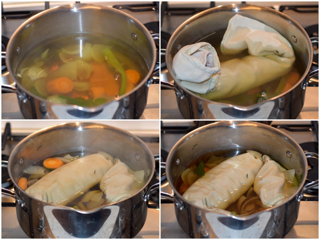 Aggiungete salsa di soia e sale nel brodo, immergete il seitan con tutto il canovaccio nel brodo e lasciate cuocere per 50 minuti, quindi lasciate raffreddare sempre dentro al brodo.