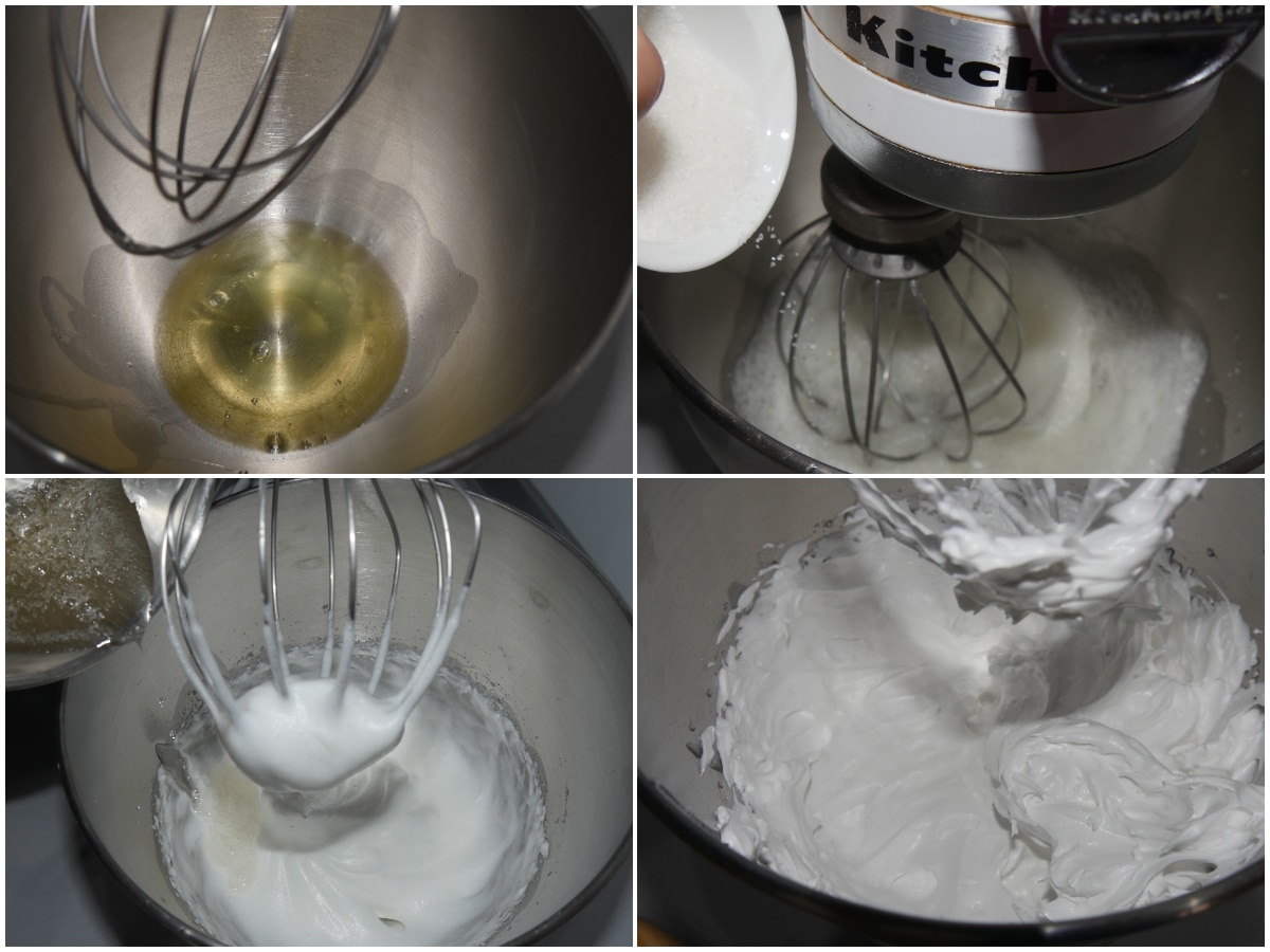 Nel frattempo, iniziate a montare gli albumi con lo zucchero (20 gr): quando saranno parzialmente montati, versate prima il succo di limone e poi, sempre continuando a montare, anche lo sciroppo, mentre è ancora bollente, continuando a montare finché la meringa non si sarà raffreddata.