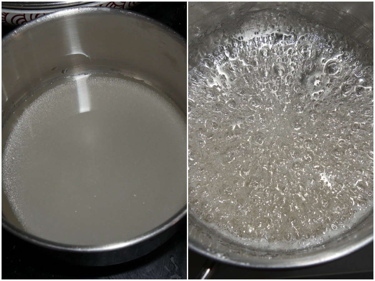 Innanzitutto preparate lo sciroppo di acqua e zucchero (80 gr) da usare per la meringa: se avete un termometro per dolci, portatelo alla temperatura di 110-120°C, altrimenti aspettate che bolla e fatelo bollire per un paio di minuti.