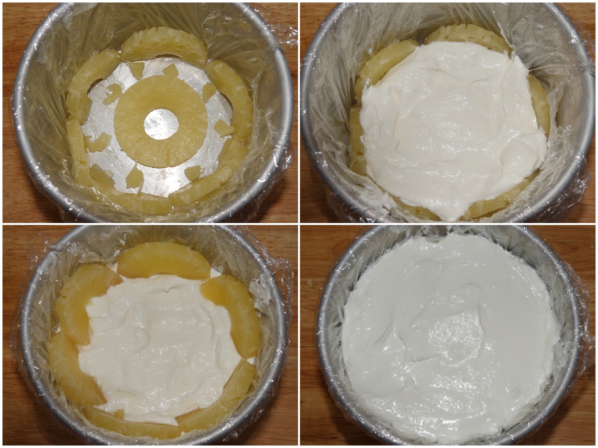 Foderate lo stampo con pellicola per dolci (o potete usare uno stampo a cerniera) e iniziate a comporre il dolce: create una decorazione di fettine di ananas sul fondo (che alla fine diventerà il top del vostro dolce), aggiungete un primo strato di crema, un secondo strato di ananas e concludete con la crema.