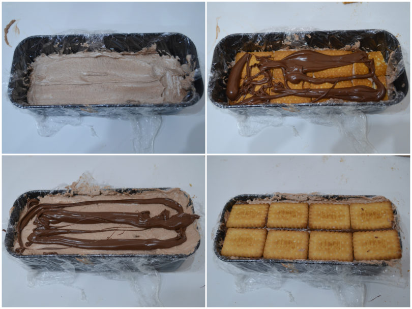 Create uno strato di biscotti, aggiungete la nutella restante, poi il secondo strato di panna e concludete con un secondo strato di biscotti.