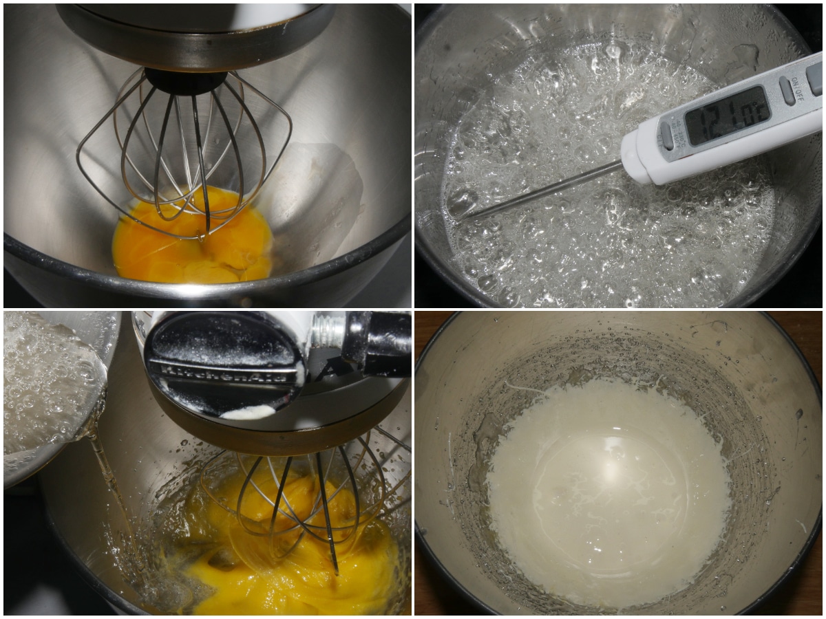 Fate la stessa cosa con i tuorli: mettete a fare lo sciroppo e nel frattempo iniziate a montare i tuorli, una volta pronto aggiungete lo sciroppo a filo continuando a montare finché non si sarà raffreddato.