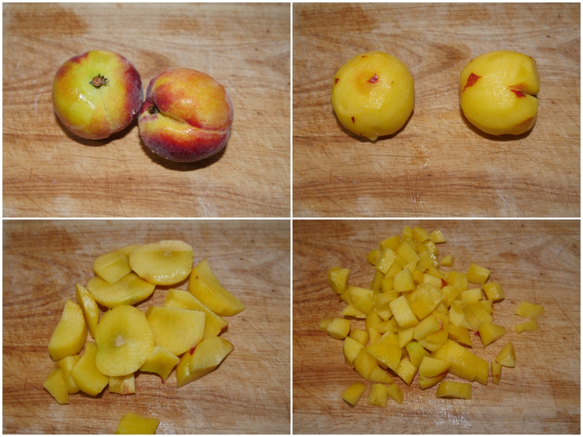 Innanzitutto sbucciate le pesche e tagliatele a dadini molto piccoli.